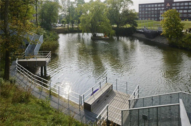 景觀設(shè)計(jì)的理念是讓人們以不同的方式去接近池塘陡峭的邊緣,這樣做的目的是在池塘周圍創(chuàng)造具有社會(huì)吸引力的場(chǎng)所和散步地。設(shè)計(jì)師建立了雙向設(shè)計(jì)原則,大池塘的西邊提供了可以駐足、坐下、觀景和約會(huì)的地方,這里的陽光甲板和平臺(tái)位于水面之上,靠近邊緣。而東區(qū)則恰恰相反,那里有一條蜿蜒的長(zhǎng)廊,包含著一些較小的社交空間,沿著落差上下排布的樓梯在局部區(qū)域是一直延伸到水面的。