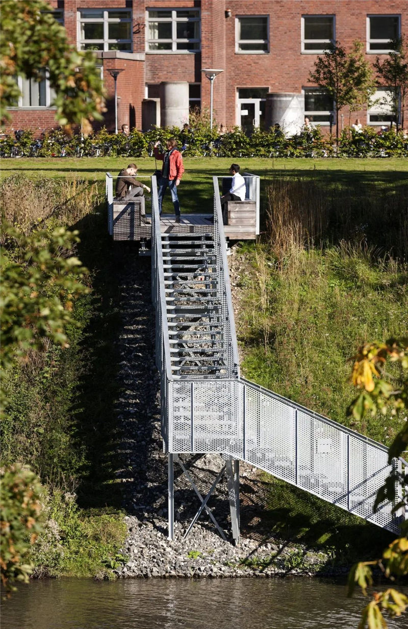 因此,東邊和西邊的設(shè)計(jì)和所用的材料也有所不同,西邊的甲板選用的是木板。三個(gè)平臺(tái)分別被命名為休息室、涼亭和劇場(chǎng),這也是設(shè)計(jì)這三個(gè)場(chǎng)地時(shí)所依據(jù)的概念。東邊是一個(gè)由拉伸鋼板和樓梯組成的裝配平臺(tái),就像你在建筑工地上看到的那種類型,這也反映了學(xué)校的一些授課內(nèi)容。東側(cè)是平緩的,幾乎漂浮在水面上,設(shè)計(jì)師在此精心安排了一條有趣的散步長(zhǎng)廊;西側(cè)堅(jiān)固、穩(wěn)定、重力高,形成了休息和社交的場(chǎng)所。