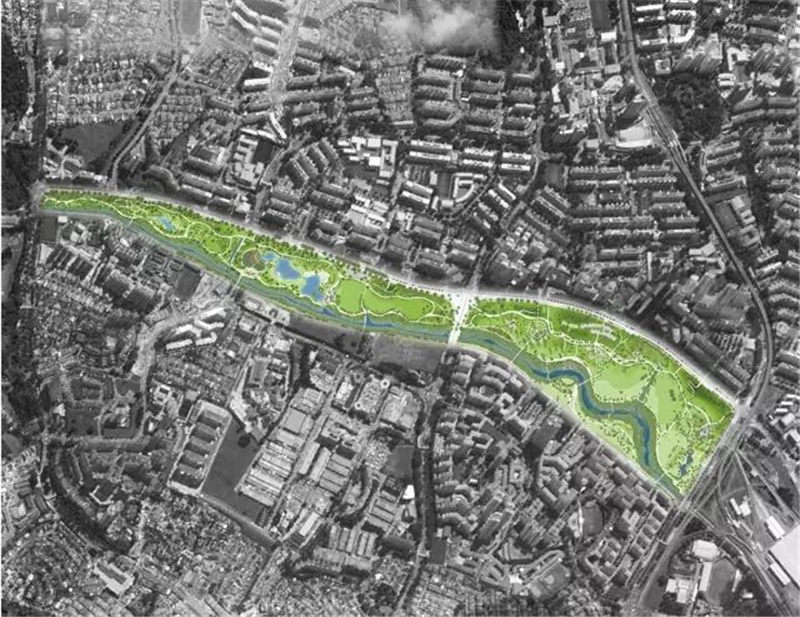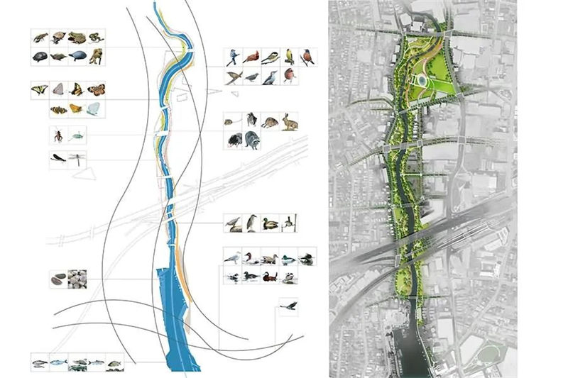 該方案在一個(gè)泛濫平原理念的基礎(chǔ)上設(shè)計(jì),當(dāng)水位低時(shí),人們能夠在寬闊的河岸沿線親近水、享受休閑活動(dòng),而在暴雨時(shí)期,河流附近的公園綠地成為一條運(yùn)輸線路,運(yùn)送下游的水流,在公園內(nèi)進(jìn)行多種土地利用,為公共活動(dòng)建造出更多的空間。